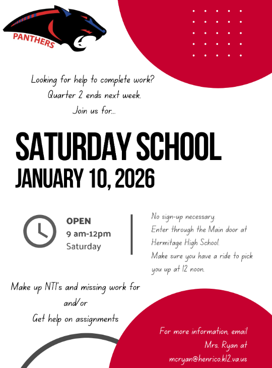 | Panther+ Tutoring HHS Teachers provide tutoring afterschool Monday, Tuesday, and Thursday every week from 4:00 - 5:30. Transportation is not provided. Students should contact Mrs. Ryan with questions. In addition, students have the opportunity to attend Saturday School from 9:00 - 12:00. Transportation is not provided. Students should contact Mrs. Ryan with questions. |
