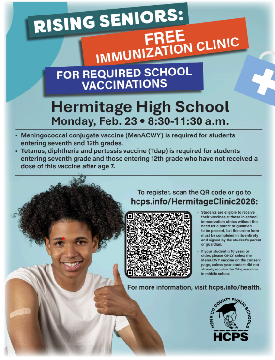 | Immunization Clinic @HHS February 23, 2026 8:30-11:30 Attention Rising Seniors! Please be sure to see Nurse Boyd or Nurse Redford for additional information about immunizations needed for the 26-27 school year. HCPS is hosting a FREE immunization event on February 23 from 8:30 - 11:30. Students must register to participate. Please use the QR code to start preparing for your senior year! |