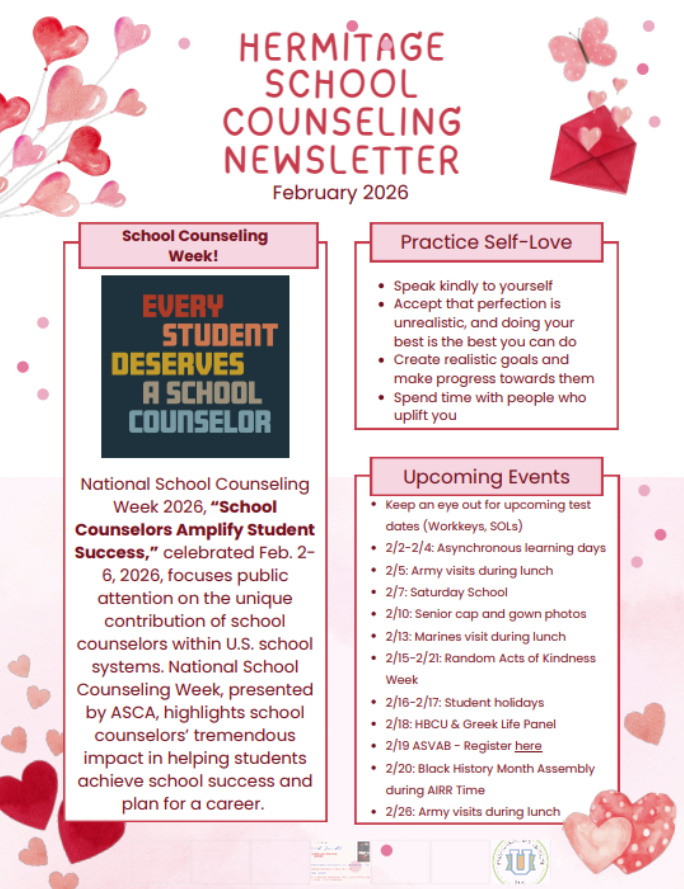 | Hermitage School Counseling Department Please see the February Newsletter as we encourage students to perform Random Acts of Kindness this month! Additional School Counseling data is also available in this newsletter! |