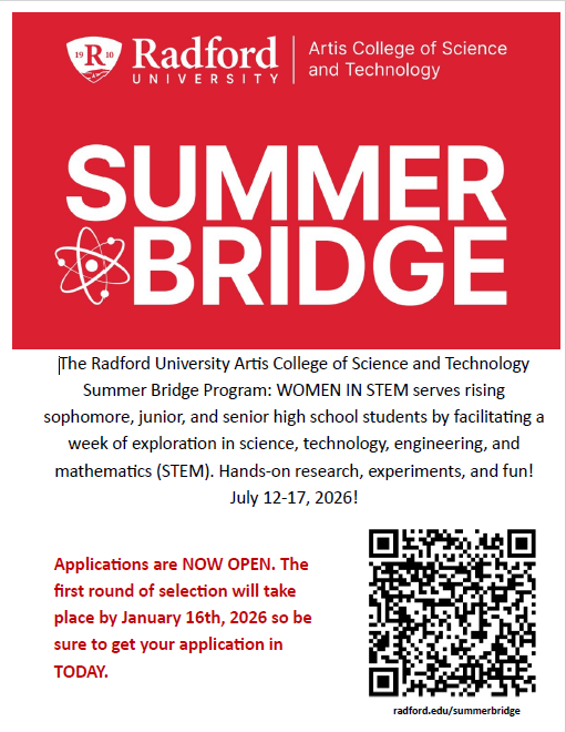 | Summer Bridge at Radford University Radford University is hosting a weeklong exploration Women in STEM (Science, Technology, Engineering, and Math) July 12-17. Please access the QR Code for additional information. |